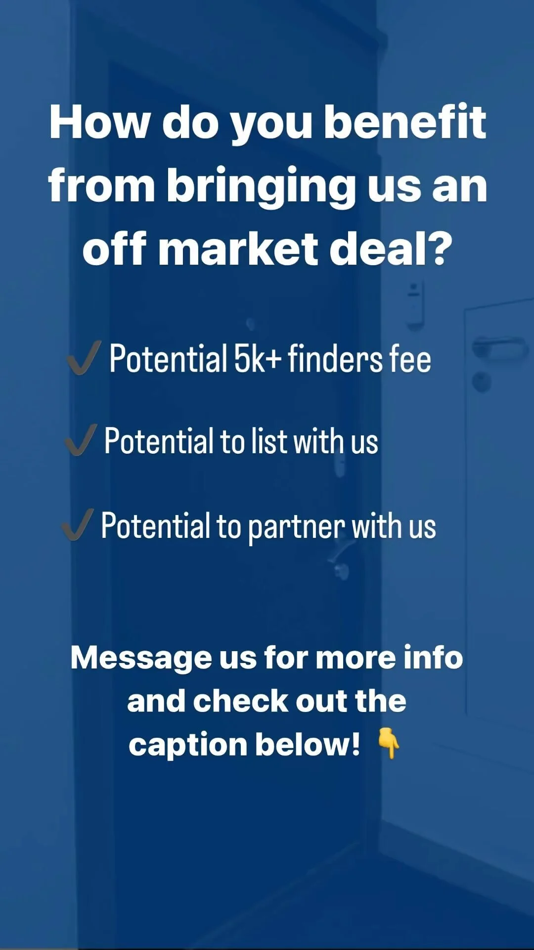 We offer a referral fee. If you bring us a deal that is successfully closed on you get compensated for it!